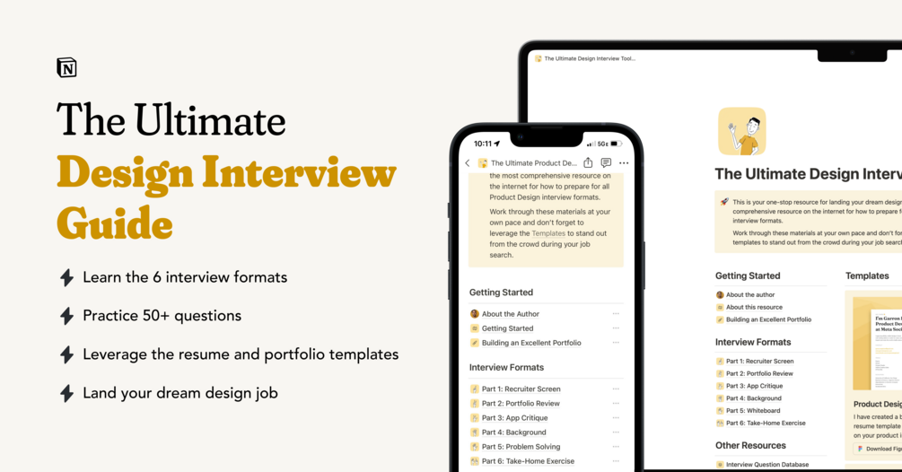 This comprehensive, free Notion template distills all of those insights to help you ace your Product Design interview. It outlines the different interview formats, how to approach them, and what questions to prepare for.
